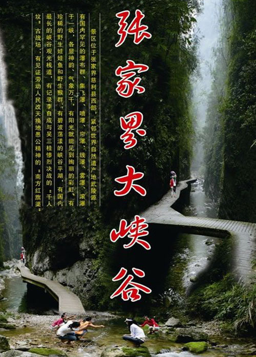 上午游覽【張家界大峽谷】峽谷間是一條清幽的小溪,沿溪邊是用木板搭建的游道, 張家界大峽谷峽谷內(nèi)不僅有傳統(tǒng)的秀美自然風(fēng)光,還云集有三朝數(shù)代的歷史人文景觀,如記錄李自成與吳三桂慘烈決戰(zhàn)的“千人墳”古戰(zhàn)場(chǎng),反映湘西歷史特色的土匪洞及見(jiàn)證解放初期湘西人民靠天勞作在絕壁間挖鑿的“南方紅旗渠”等。